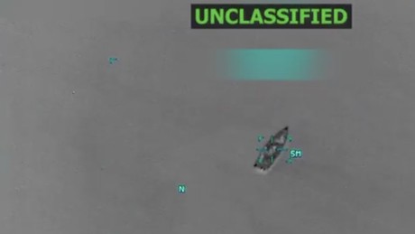 Ein von dem US-Präsidenten veröffentlichtes, etwa 30 Sekunden langes Video zeigt offenbar ein stillstehendes Schiff in einem Gewässer, das von einem Projektil getroffen wird und anschließend explodiert.