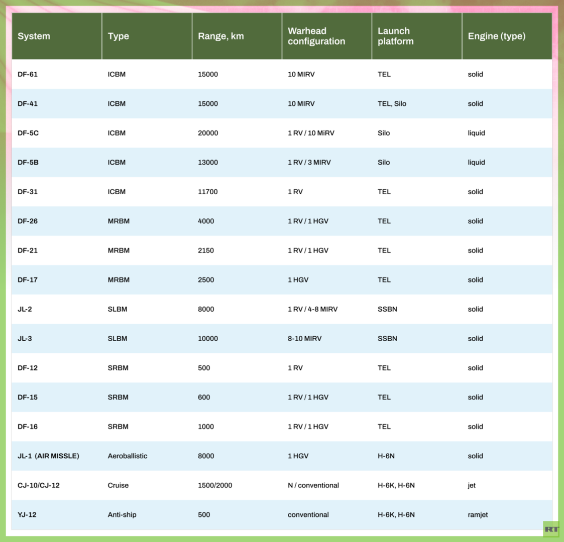 Chinas Raketenprogramm begann mit dem Reverse Engineering sowjetischer R-2-Raketen, die an die VBA übergeben wurden. Heute verfügt Peking über das gesamte Spektrum an land- und seegestützten ballistischen Raketen: schwere Flüssigtreibstoff-Silo-ICBM, mobile Feststoffsysteme und SLBM (die Marinekomponente, auf die wir später noch eingehen werden). Alle Sprengköpfe können mit MIRVs (Unabhängig Zielbarer Mehrfach-Wiedereintrittskörper) ausgestattet werden.
