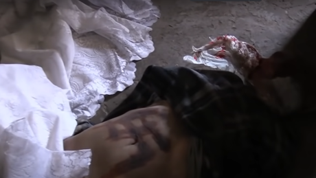 Dann kommt es zu einer grausamen Entdeckung im Schulkeller – einer mit Fenstervorhängen bedeckten Frauenleiche. Zu sehen ist nur der Bauch mit einem eingebrannten Hakenkreuz. "Oh", sagt der Reporter und filmt aus der Nähe. Für einen Moment macht er das blutverschmierte Gesicht frei und macht einen Screenshot. Späteren Meldungen der russischen Presse zufolge waren der Frau beide Arme abgehackt.