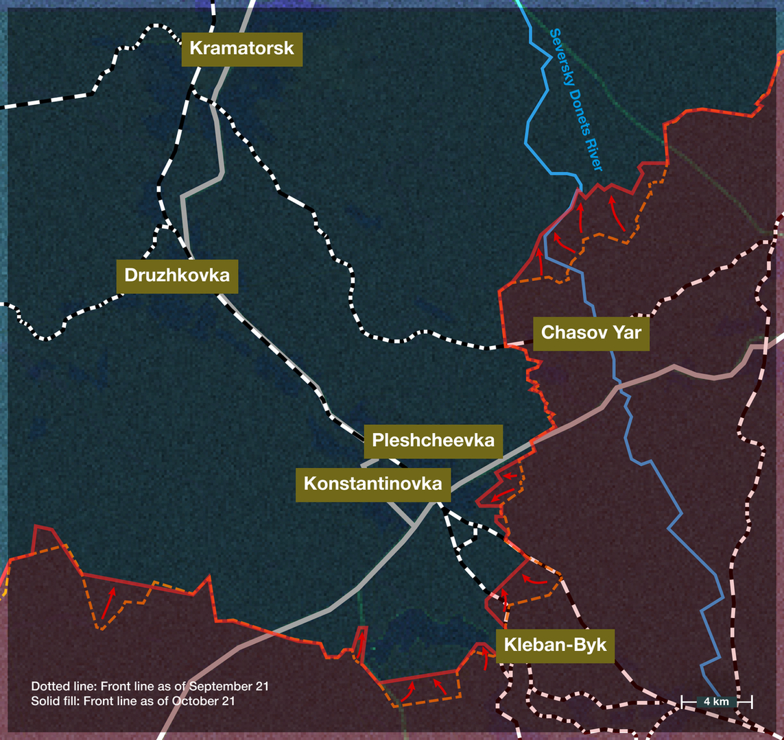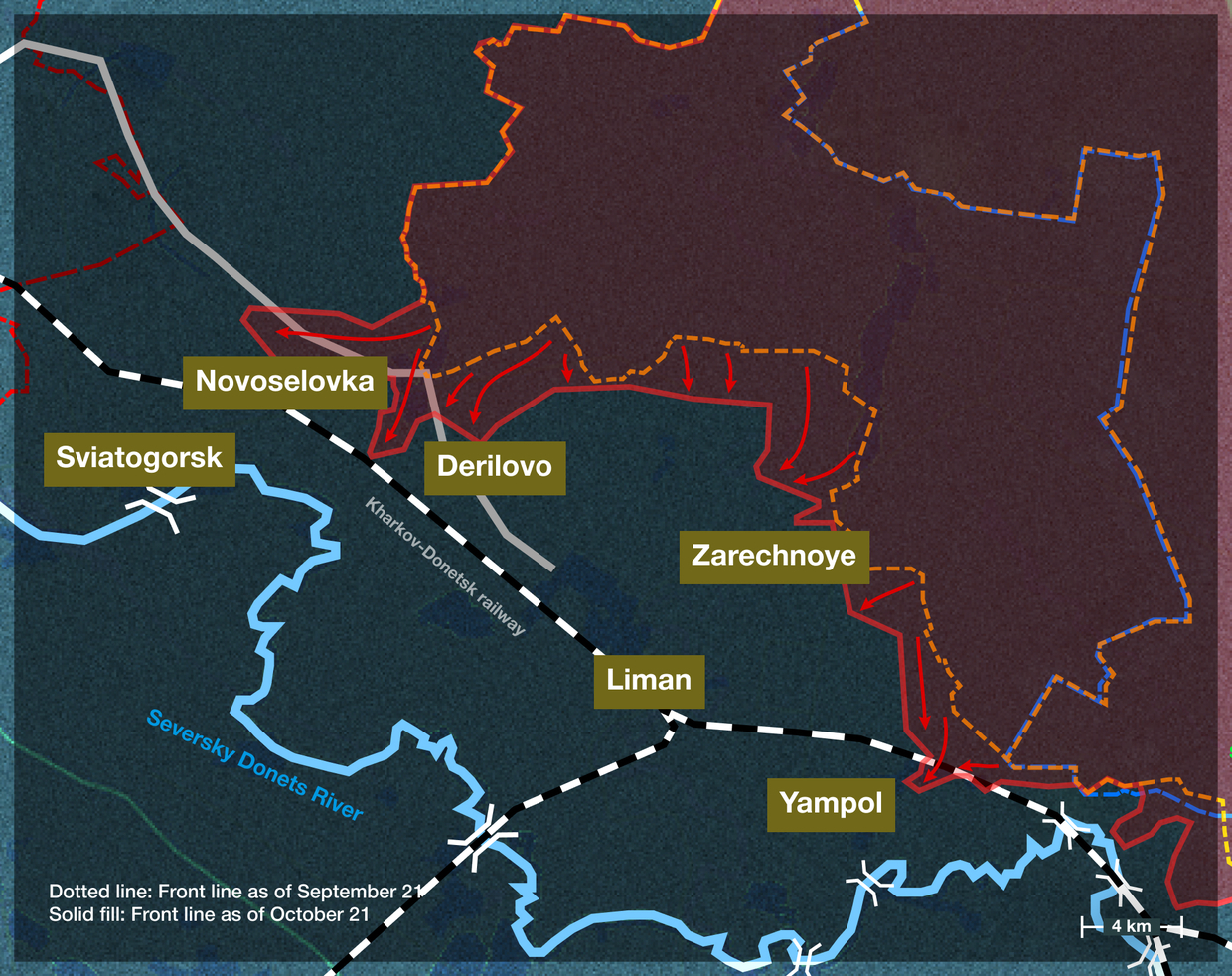 Russische Truppen rücken immer näher an Liman heran. Wie auch anderswo oft zu beobachten, deutet eine Halbumzingelung häufig darauf hin, dass ein direkter Angriff bevorsteht. Im Norden sind russische Einheiten entlang einer 35 Kilometer langen Front sieben bis acht Kilometer vorgerückt, haben den Fluss Nitrius überquert und Abschnitte der Eisenbahnstrecke Charkow–Liman–Artjomowsk (ukrainischer Name: Bachmut) an zwei Stellen gesichert. Zu den eingenommenen Siedlungen gehören Derilowo, Nowosjolowka, Saretschnoje (jetzt vollständig unter Kontrolle) und Jampol.