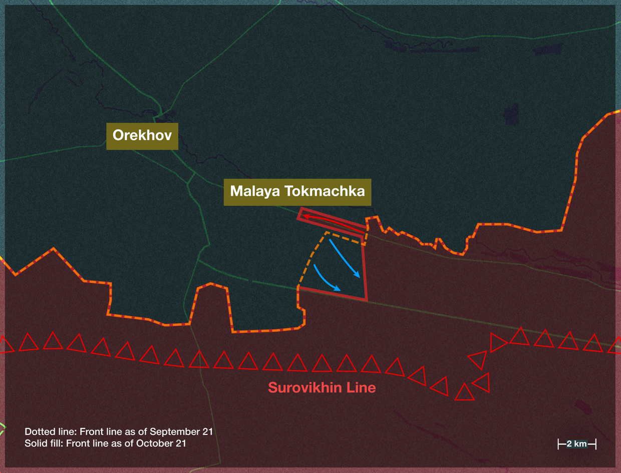 Die Orechow-Front hat sich nach dem Dobropolje-Bogen zur zweiten Hauptachse der ukrainischen Offensive entwickelt. Trotz einer energischen Propagandaoffensive in den ukrainischen Medien sind die tatsächlichen Fortschritte bescheiden: In der Nähe von Malaja Tokmatschka wurden etwa vier bis sechs Quadratkilometer gewonnen, ohne dass Siedlungen eingenommen wurden.
