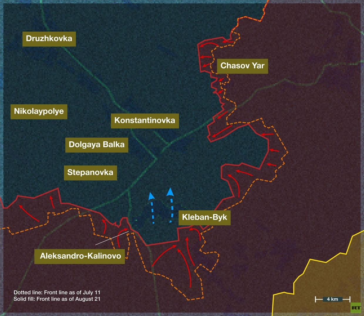 Zunächst eroberte die russische Armee den Mikrodistrikt "Kanal" am östlichen Ufer des Kanals; Anschließend errichteten die Truppen Stellungen im Westen und eroberten große Teile der Stadt. Tschassow Jar wurde offiziell am 31. Juli 2025 befreit; bis zum Jahresende hatte sich die Frontlinie jedoch nur um wenige Kilometer von der Stadt entfernt.