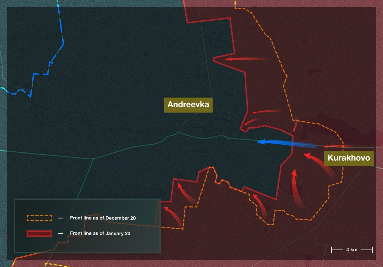 Die Stadt Kurachowo (vor dem Krieg 18.500 Einwohner) ist von zentraler Bedeutung für die gesamte südliche Donbass-Region. Nach ihrer vollständigen Befreiung Anfang Januar startete die russische Armee eine Offensive nach Westen, die seither 80–90 Kilometer vorgerückt ist.