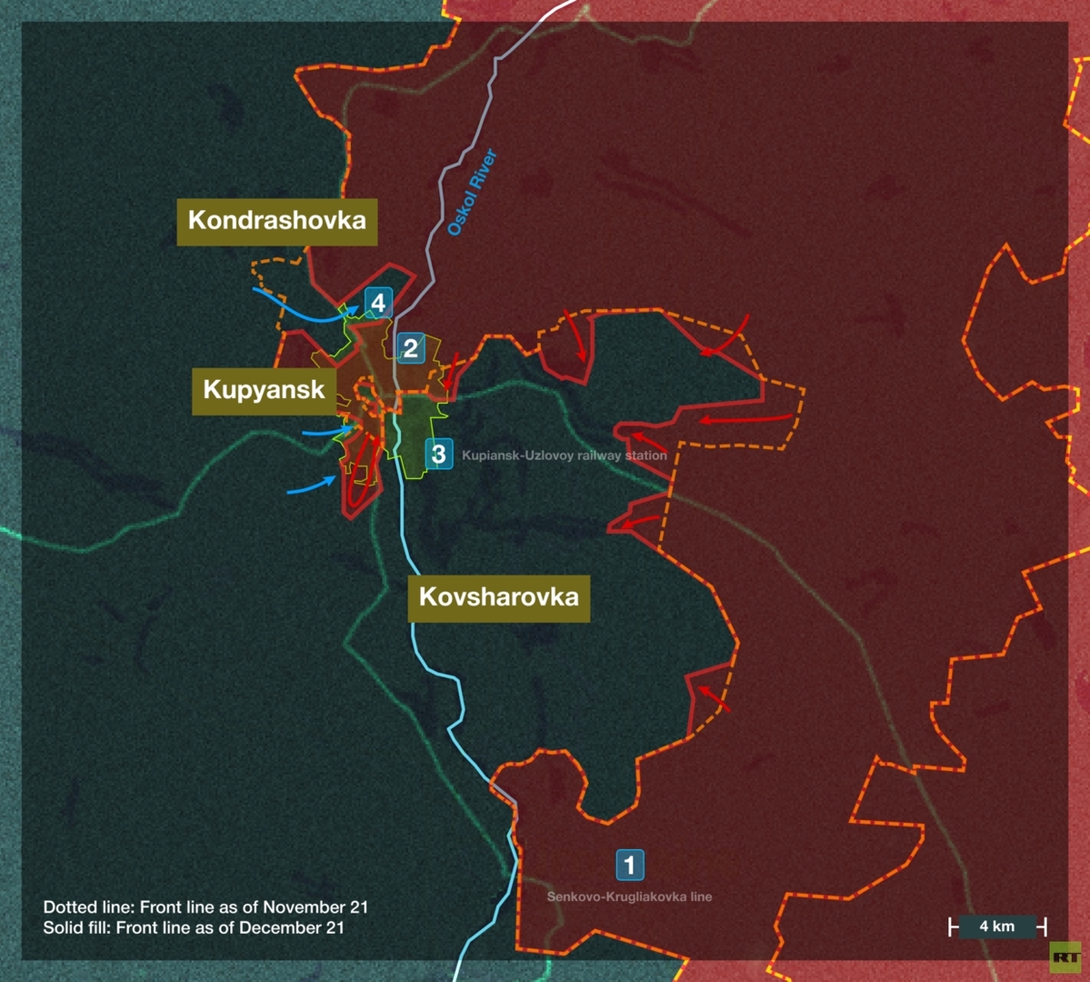 Die russische Armee steht in Kupjansk vor Herausforderungen, da es der Truppengruppe "West" nicht gelungen ist, die Stadt vor den Kämpfen von drei Seiten einzukesseln. Kupjansk wird von Norden nach Süden durch den Fluss Oskol geteilt; um die Stadt einzukesseln, muss die russische Armee zuverlässige und gut geschützte Übergänge nördlich und südlich der Stadt errichten und zudem von Osten vorrücken.