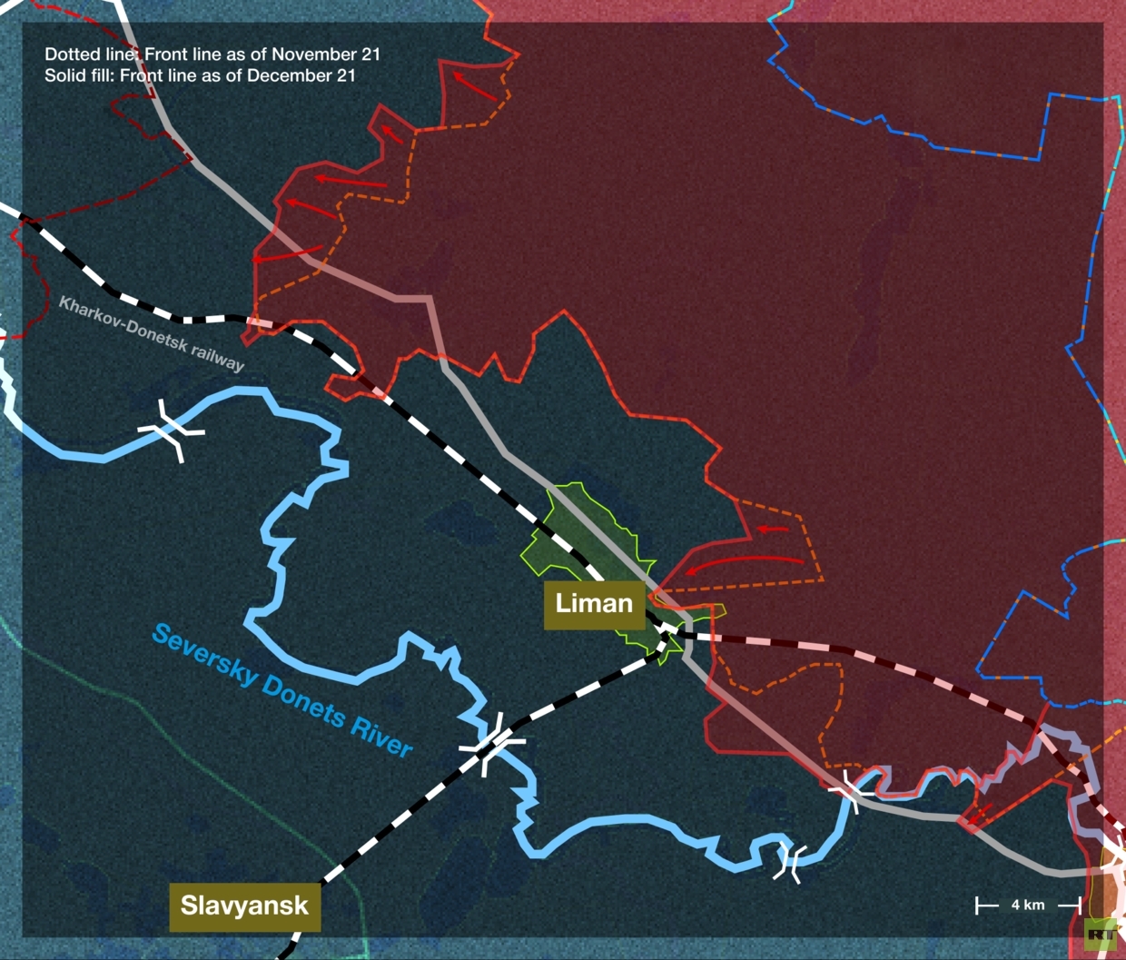 Im vergangenen Monat wurde die Ostflanke der Stadt vollständig isoliert, und ein sieben Kilometer langer Straßenabschnitt zwischen Liman und Sewersk ist abgeschnitten. Die teilweise Einkesselung der Westflanke hat sich ausgeweitet, und in der Stadt selbst dauern die heftigen Kämpfe an.