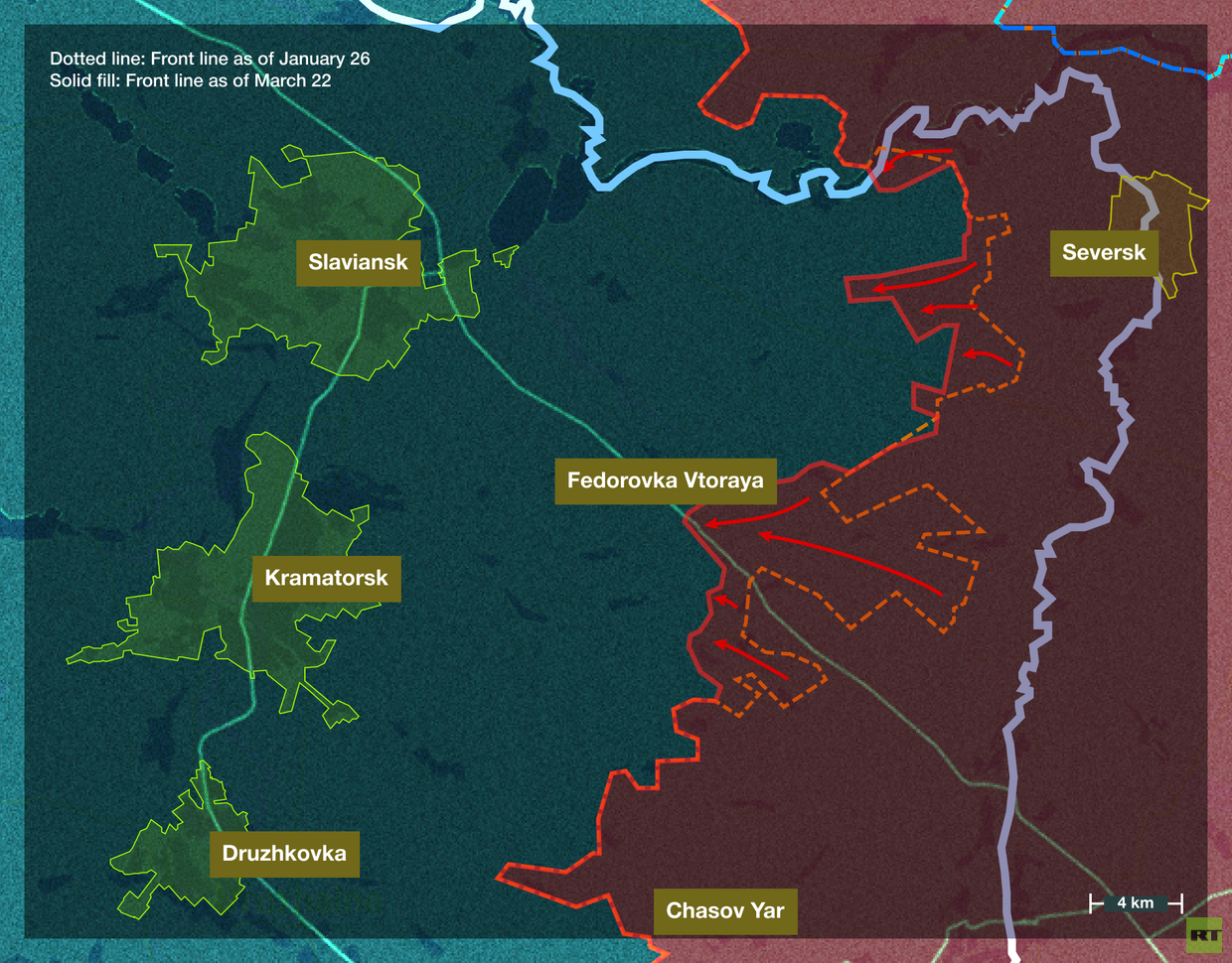 Sewersk (eingenommen am 11. Dezember) war ein wichtiger Zwischenstopp auf dem Weg zu einem Schlüsselgebiet im Donbass – dem Ballungsraum Slawjansk-Kramatorsk. Die Gruppe "Süd" der russischen Streitkräfte muss 25–30 Kilometer zurücklegen, um Slawjansk-Kramatorsk zu erreichen, und dabei eine beträchtliche Höhe überwinden. Ein Teil dieser Route wurde bereits zurückgelegt, wobei es den russischen Truppen gelang, die ukrainische Hauptverteidigungslinie in dieser Richtung einzukesseln und heftige Kämpfe um sie zu führen.