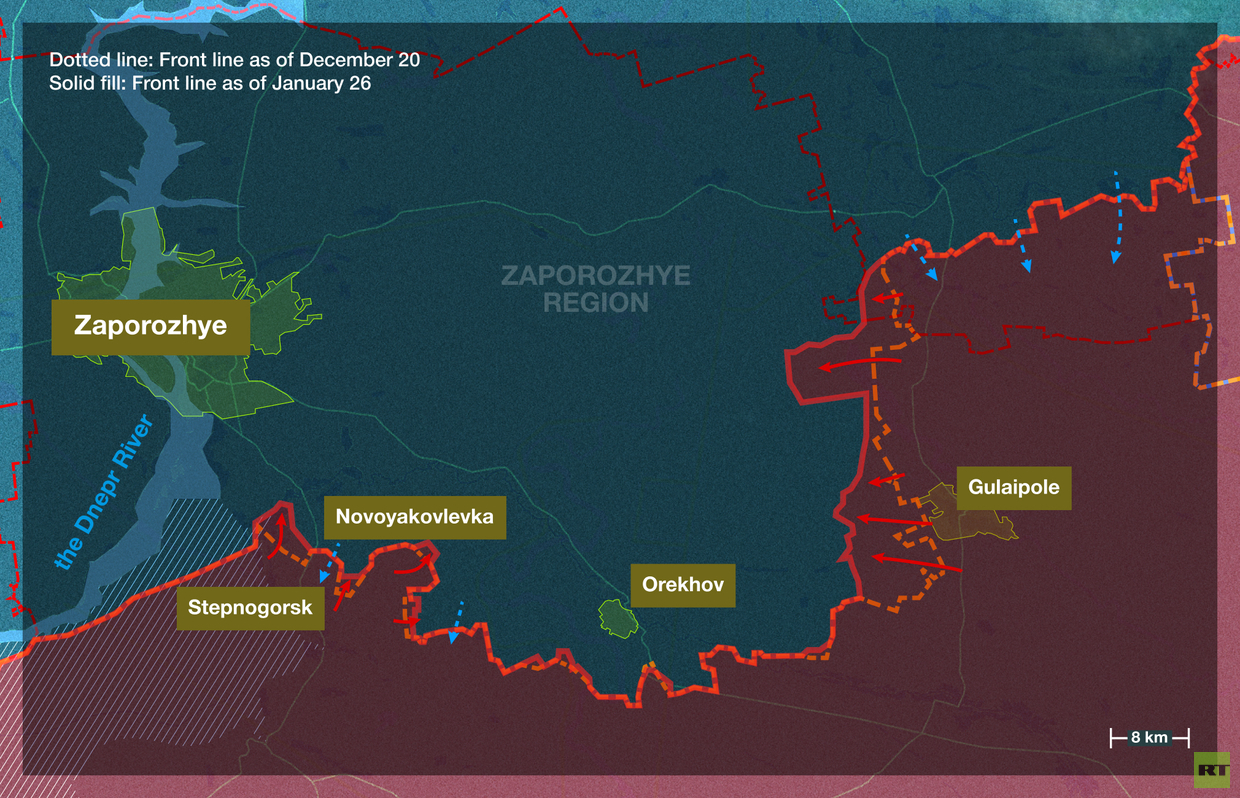 Das gleiche Ergebnis zeigte sich in Richtung Dnjepr. Der Versuch der ukrainischen Streitkräfte, die Nordflanke der Gruppe Dnjepr mit einem Angriff auf Stepnogorsk abzuschneiden, scheiterte, wenngleich der russische Vormarsch offenbar etwas gebremst wurde. Die Personalschwäche der ukrainischen Kampfverbände tritt hier jedoch deutlicher zutage als in der Nähe von Guljaipolje. Es existiert praktisch keine geschlossene Front, was es russischen Sturmgruppen ermöglicht, hinter die Linien der ukrainischen Streitkräfte vorzudringen; der ukrainischen Armee fehlt die Stärke, diese Vorstöße rechtzeitig zu erkennen. So eroberte die russische Armee inmitten der andauernden ukrainischen Gegenangriffe unerwartet Nowojakowlewka, ein strategisch wichtiges Dorf, das die Nachschubwege nach Orechow sichert.