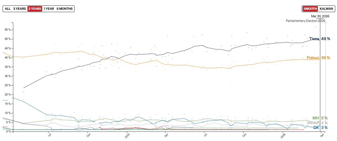 Magyars Tisza liegt laut einer von Politico zusammengestellten Auswertung derzeit mit 49 zu 39 Punkten vor Fidesz. Die einzelnen Meinungsumfragen variieren jedoch stark, je nach politischer Ausrichtung und Finanzierung der Meinungsforschungsinstitute.