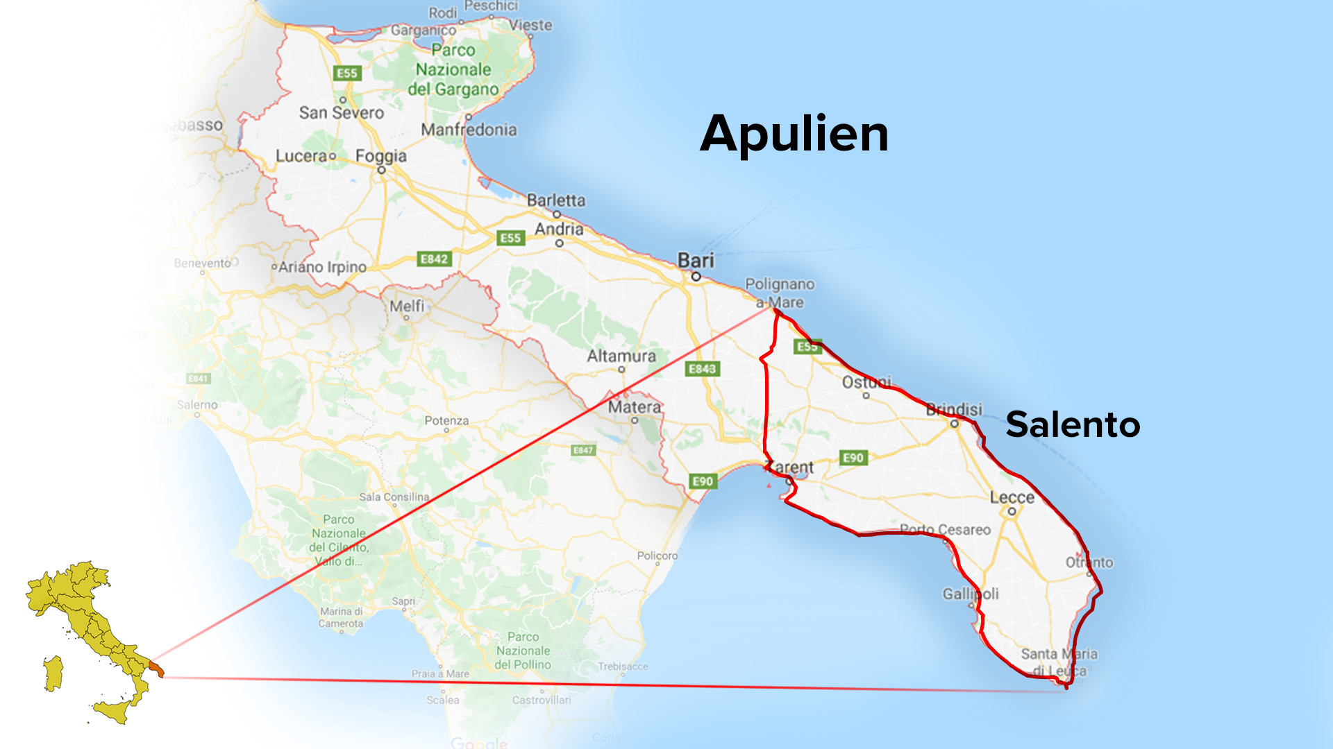 Apulien gehört zu einer der beliebtesten Urlaubsregionen in Italien. Im Salento, der Halbinsel, die den Absatz des italienischen Stiefels bildet, stechen die historischen und wunderschönen Städte wie Lecce oder Ostuni genauso hervor wie das glasklare Wasser der Adria im Osten und des Ionischen Meers im Westen. Dazu kommt der weltbekannte Wein Negroamaro, ein roter Tropfen, der die Seele Apuliens widerspiegelt. Und, nicht zu vergessen, natürlich die teilweise über 1.000 Jahre alten Olivenbäume.