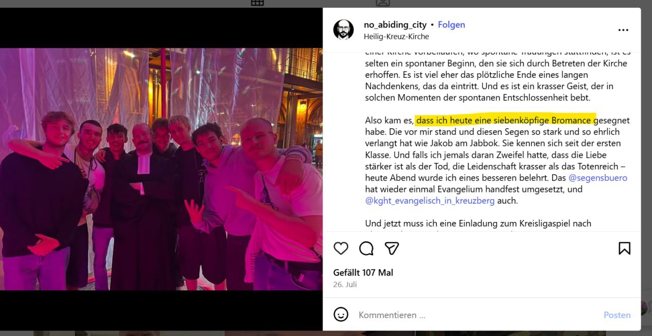 In der evangelischen Kirche werden seit Jahren homosexuelle Paare getraut. Im Juli berichtete ein evangelischer "Bundeswehrpfarrer" stolz, er habe eine "siebenköpfige Bromance" gesegnet.