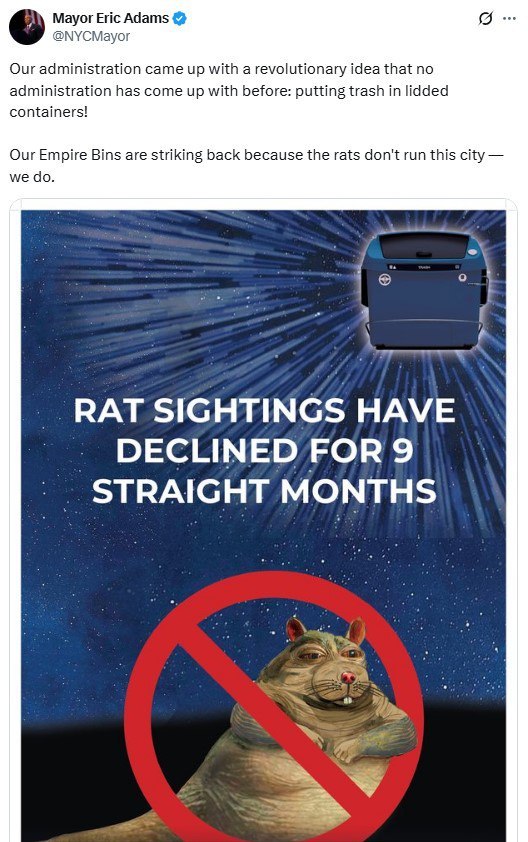 Der Wahnsinn des Tages kommt heute ausnahmsweise aus den USA. New Yorks scheidender Bürgermeister Eric Adams (Demokraten) hat sich am Freitag auf X einer "Innovation" gerühmt, die er als "revolutionäre Idee" bezeichnete: Die Mülltonnen mit Deckel, die seine Verwaltung eingeführt habe, hätten zum Rückgang der Sichtungen von Ratten in der US-Metropole geführt.