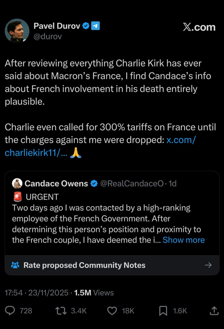 Pawel Durow (bekannter in der englischen Schreibweise Pavel Durov), Mitbegründer der Online-Chatmessengers Telegram, hat die Möglichkeit eingeräumt, dass Frankreichs Regierung am Mord am US-amerikanischen konservativen Aktivisten Charlie Kirk beteiligt ist. Genauer, er kommentierte in einem Beitrag auf X die Veröffentlichung von Informationen über Kirks Mörder durch die US-amerikanische Journalistin Candace Owens: