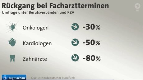 Immerhin erfährt man nebenbei, dass Patienten sich über von ihren Ärzten abgesagte Termine beklagten. Dann bekommt der Zuschauer eine Grafik vorgesetzt, in dem der Rückgang der Facharzttermine dargestellt wird: bei Onkologen 30, bei Kardiologen 50, bei Zahnärzten sogar 80 Prozent.