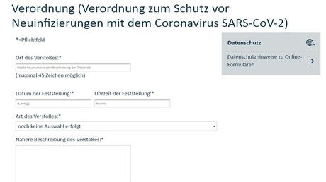 Auf der Internetseite der nordrhein-westfälischen Großstadt gibt es ein Online-Meldeportal für Corona-Verstöße. Es trägt den Titel: "Melden eines Verstoßes gegen die Coronaschutz-Verordnung (Verordnung zum Schutz vor Neuinfizierungen mit dem Coronavirus SARS-CoV-2)". Angegeben werden sollen Ort, Datum, Uhrzeit und Art des Verstoßes, zum Beispiel das Nichttragen einer Maske oder unzulässige Veranstaltungen. Auch das Hochladen von Fotos "zu dem Verstoß" ist möglich. Die Angaben zur eigenen Person sind optional.