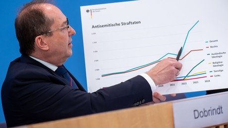 2024 wurden demnach "6.236 antisemitische Straftaten" in Deutschland registriert, was einem "Anstieg von knapp 21 Prozent" im Vergleich zum Vorjahr 2023 (5.164 Delikte) entspräche. Gelistet unter dem Begriff "Hasskriminalität". Laut vorbereiteter Tafel läge demnach die Zahl ermittelter "rechter" Straftaten vor den Ereignissen anderer Motivation. Dazu heißt es: