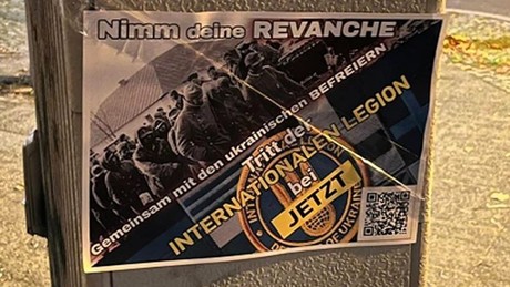 Im Berliner Bezirk Charlottenburg-Wilmersdorf rufen Plakate und kleinere Flugblätter zur Teilnahme am Kampf im Ukrainekrieg auf. Darauf machten viele Internetnutzer und Zeitungsleser aufmerksam, indem sie an die Redaktionen mehrerer Zeitungen entsprechende Fotos schickten. So berichteten zuerst das Overton-Magazin und später auch die Berliner Zeitung über die Aktion.