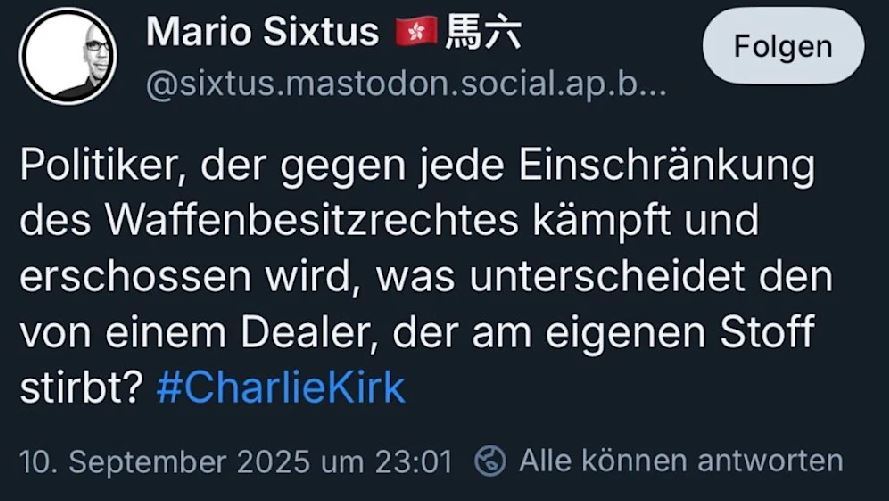 "Kommentatoren spekulierten unter dem Post des Außenministeriums, dass es sich bei dem Deutschen um den ZDF-Drehbuchautor und Publizisten Mario Sixtus handele. Auch Bild schreibt, dass Sixtus kurz nach dem Attentat auf Kirk einen Post mit dem zitierten Wortlaut auf Bluesky abgesetzt habe. Die Redaktion der Frankfurter Rundschau von Ippen.Media konnte dies nicht unabhängig prüfen. Viele der Kommentatoren auf X scheinen allerdings einen rechten Hintergrund zu haben."
