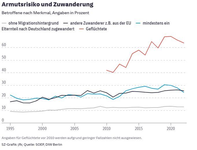 Die Süddeutsche Zeitung zitiert vorab Daten aus einer Studie des Deutschen Instituts für Wirtschaftsforschung (DIW) zum Thema "Einkommensungleichheit und Armutsrisiko" (Bezahlschranke). Laut SZ-Resümee würde sich in der Untersuchung darlegen, dass die Entwicklung des Armutsrisikos in Deutschland "stark durch Zuwanderung geprägt ist." Bei annähernd gleichbleibenden Zahlen bei den Menschen ohne ausländische Wurzeln, zeige sich "bei den Geflüchteten dagegen ein drastischer Anstieg", mit einem Spitzenwert von "fast 70 Prozent im Jahr 2020". Dieser Wert würde nun durch statistische Tricks, ausgehend "der zunehmenden Arbeitsmarktintegration" in Minijobs und im Niedriglohnsektor, als "gute Nachricht" wieder "etwas sinken".