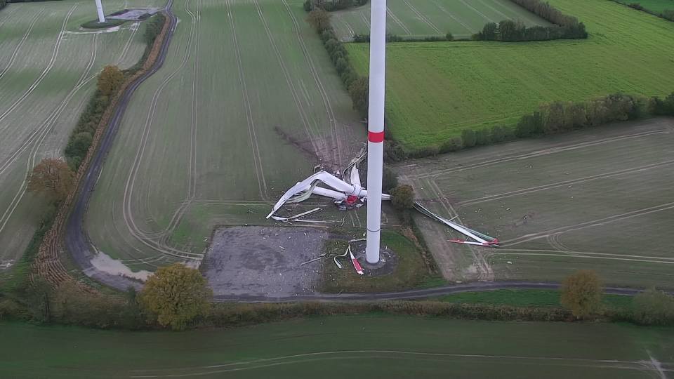 "Am Montagmorgen stürzte der Kopf einer Windkraftanlage aus 125 Metern Höhe auf ein Feld im Münsterland und zerbarst in unzählige Einzelteile."