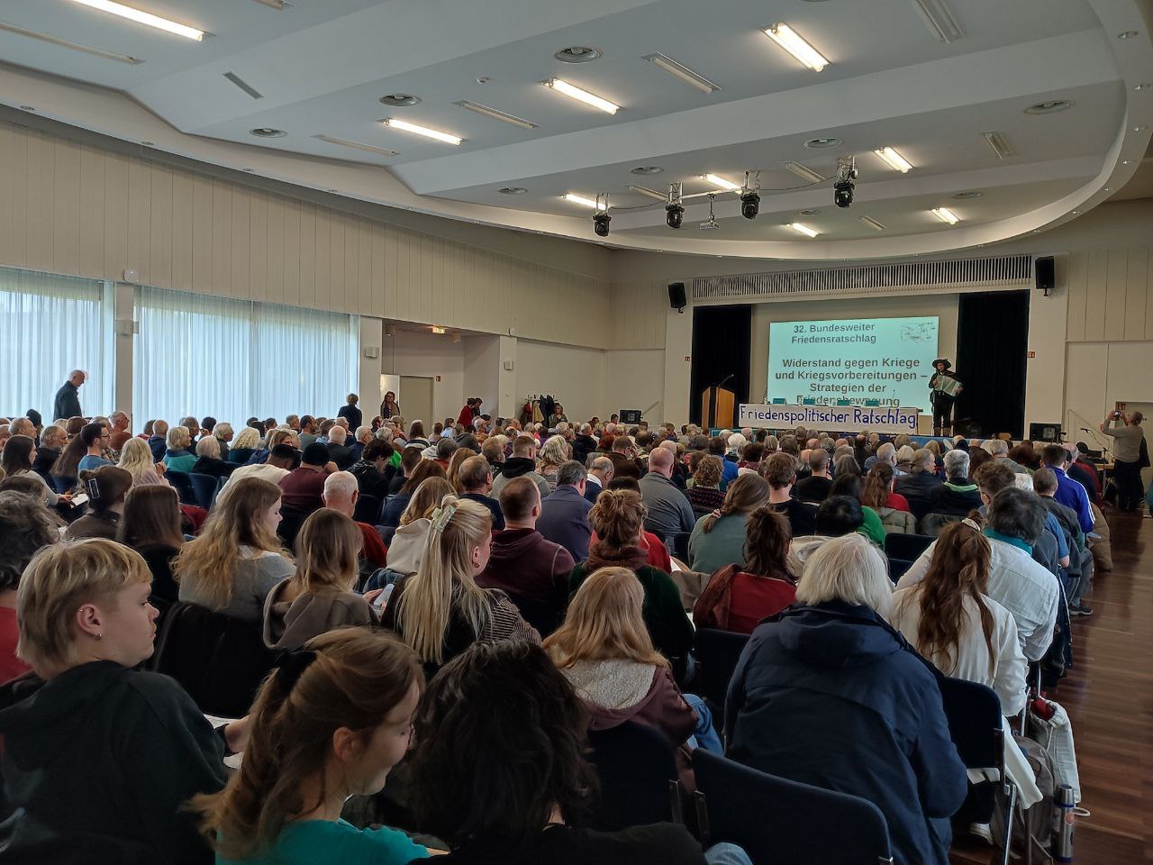 Auf dem 32. Bundesweiten Friedensratschlag trafen sich am Wochenende rund 400 Vertreter von Friedensinitiativen aus ganz Deutschland. Damit bleibe der Ratschlag in diesem Jahr das größte Treffen zur Vorbereitung von Demonstrationen und Kämpfen, zum Beispiel gegen Waffenlieferungen in die Ukraine und gegen den Völkermord in Gaza, erklärte Jutta Kausch-Henken von der Initiative Nie wieder Krieg – Die Waffen nieder in ihrer Eröffnungsrede.