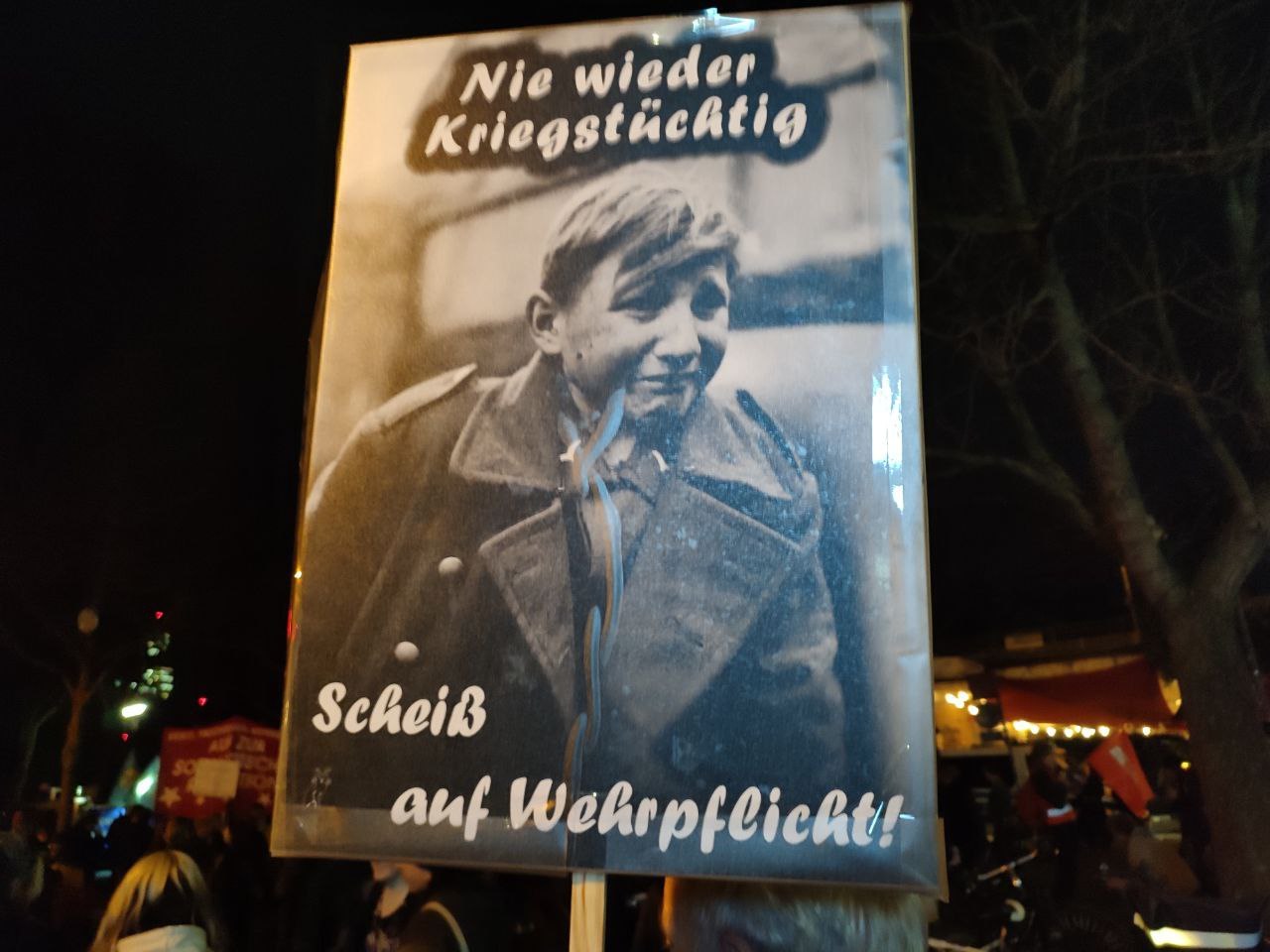 Zwei Tage vor dem Beschluss zur Wehrpflicht habe sich der Reservistenverband der deutschen Bundeswehr dazu geäußert: Deutschland benötige 300.000 aktive Soldaten und knapp eine Million Reservisten im Inneren. Diese aber brauche man nicht nur für den Kampf gegen äußere Feinde, so der Kundgebungsredner, sondern auch für die Repression gegen Wehrdienstverweigerer und Streikende in den Fabriken. Das Programm der Regierung sei viel umfangreicher, als das, was sie uns gerade erzählen würden. Deshalb wäre der heutige Protest nur ein Anfang. Die Komitees gegen die Wehrpflicht befänden sich im Aufbau.