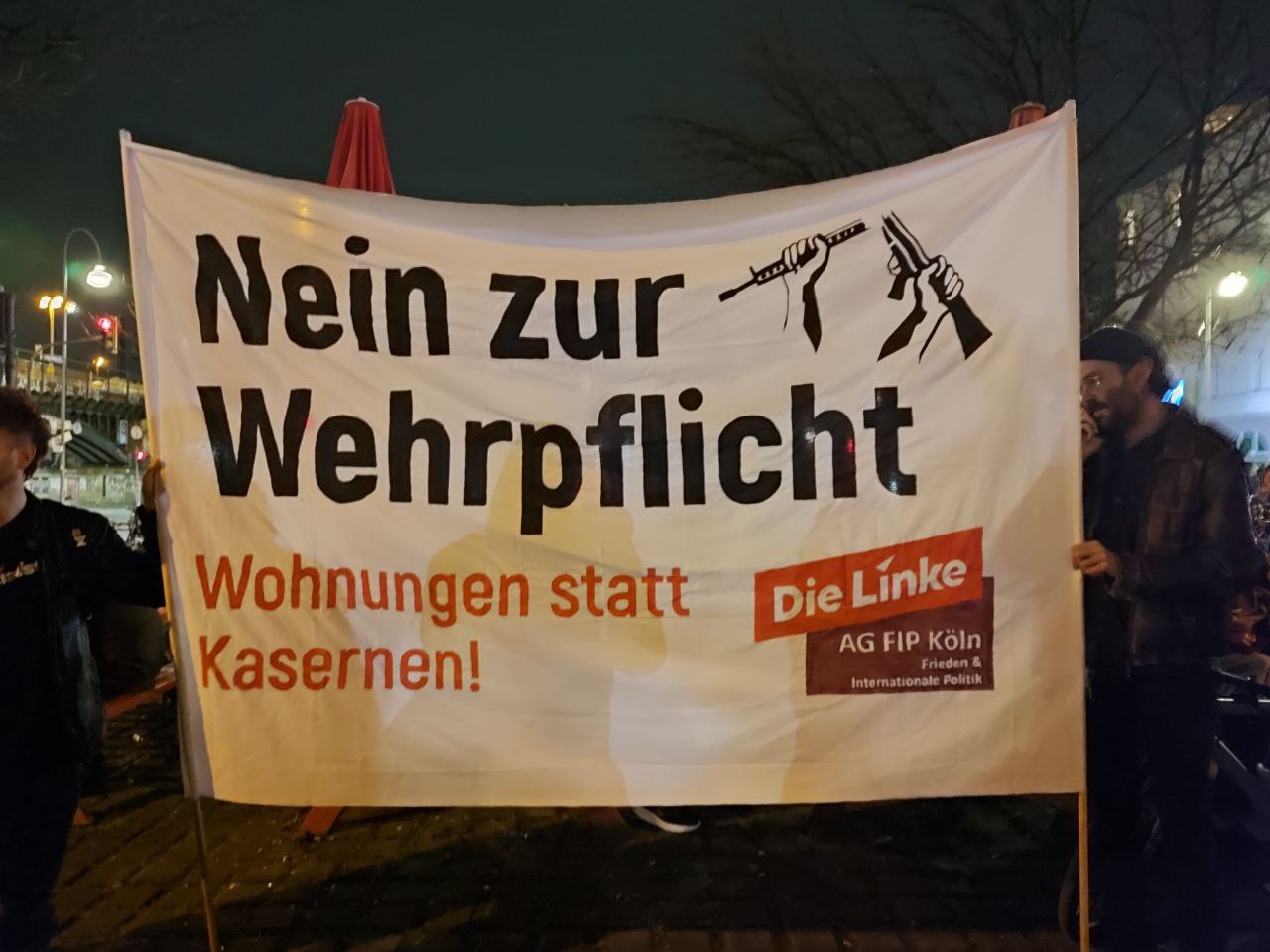 "Die Jugend wolle eine Zukunft, die Reichen wollen Krieg", skandierten Teilnehmer einer linken Bündnisdemonstration gegen die Wehrpflicht am Freitagabend in Köln. Zwei Tage nach dem Beschluss zur Wehrpflicht versammelten sich rund 300 größtenteils junge Menschen vor dem Haus des Deutschen Gewerkschaftsbundes zu einer Kundgebung.