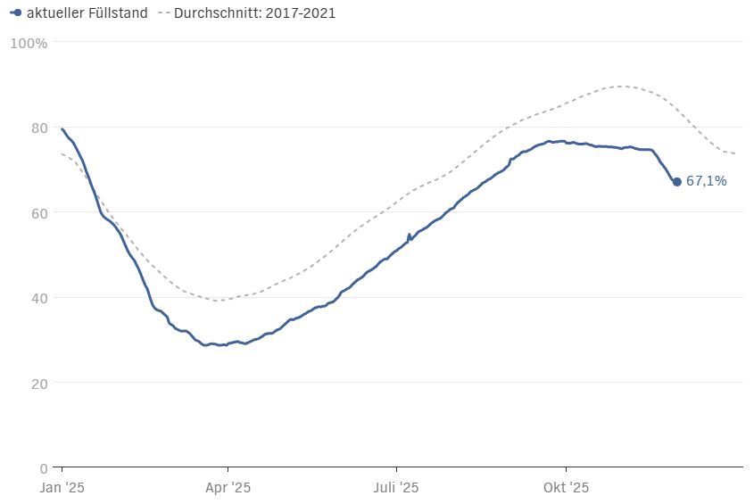 Der Sender NDR ermöglicht interessierten Bürgern auf seiner Webseite den Blick auf den Füllstand in Deutschlands Gasspeichern. Die abrufbare Grafik belegt dabei den aktuellen Tiefstand von 67,1 Prozent am 30. November.