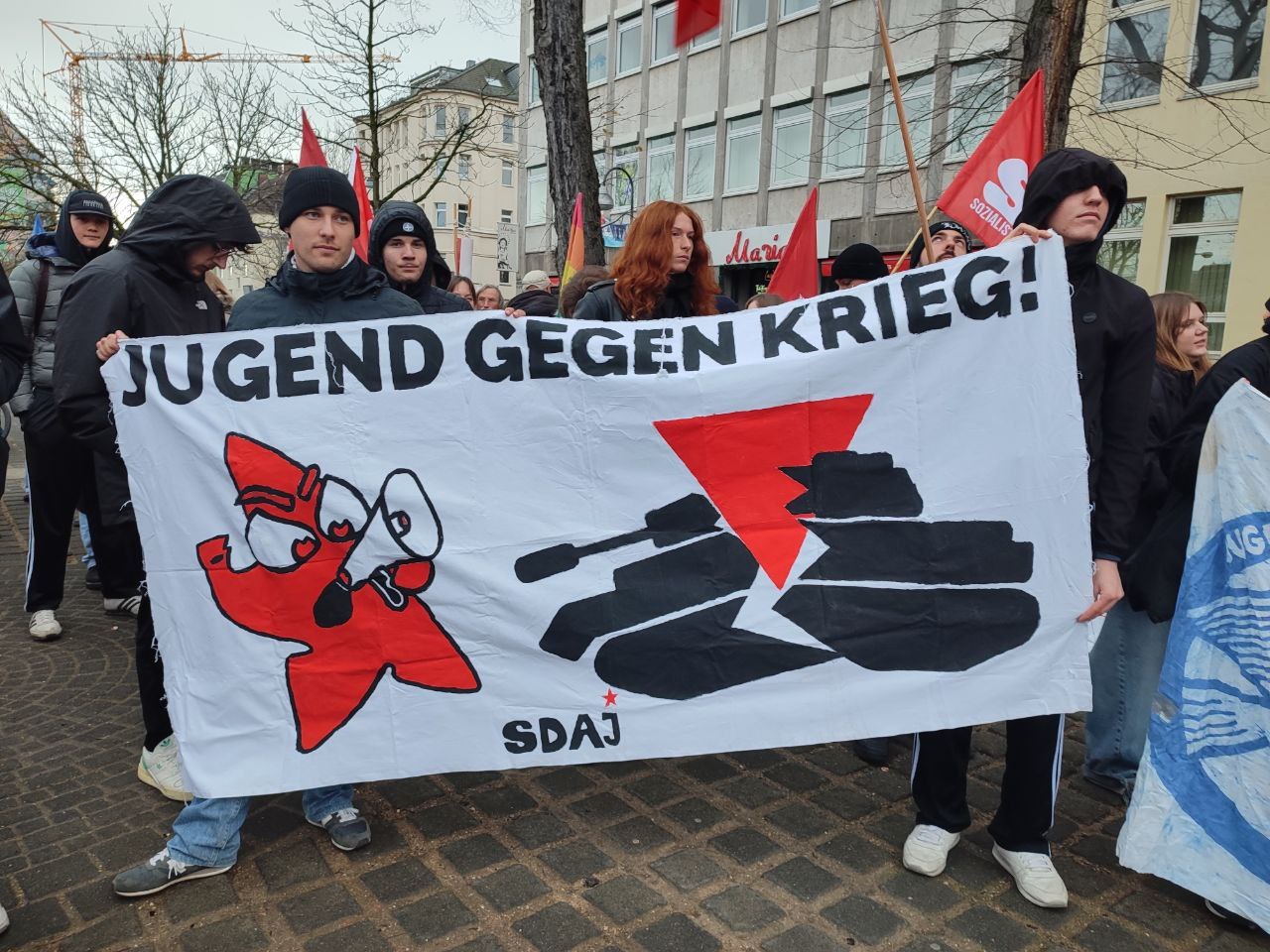 Schon jetzt litten Menschen weltweit an Kriegen, von denen deutsche Rüstungskonzerne profitierten. Statt auf Kosten von Menschen in anderen Ländern Krieg zu führen, wolle die Jugend echte Zukunftschancen. Gereon von der SDAJ (Sozialistische Deutsche Arbeiterjugend) erinnerte daran, dass Bundeskanzler Friedrich Merz ganz klar gesagt habe, es werde nicht bei der Freiwilligkeit der Wehrpflicht bleiben.