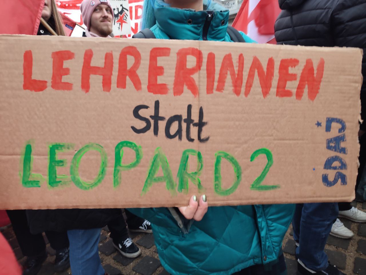 Stattdessen wolle Deutschland selbst einen Krieg vorbereiten, und nur dafür brauche es wie angekündigt eine Armee mit 460.000 Soldaten, so der Friedensaktivist von der SDAJ. Bei der Aufrüstung gehe es nicht um das Wohl der Menschen in diesem Land, es gehe einzig und allein um Profite für Konzerne.