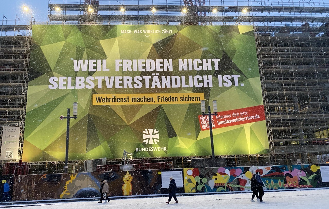 Eine Konsequenz aus den aktuellen Entwicklungen müsse lauten, sich sicherheitspolitisch neu aufzustellen. Auf dem Berliner Alexanderplatz präsentiert die Bundeswehr seit Mitte der Woche eine großflächige Werbekampagne: