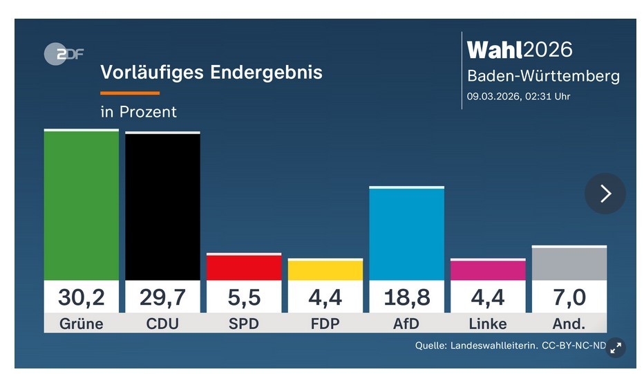 Bei der Landtagswahl in Baden-Württemberg haben sich die Grünen bei der Zustimmung der Bürger final knapp gegen die CDU durchgesetzt und kommen auf 30,2 Prozent der Stimmen (2021: 32,6 Prozent). Die CDU sicherte sich mit 29,7 Prozent (24,1 Prozent) den 2. Platz als kommender Koalitionspartner. Stärkste Oppositionskraft wird die medial zum Wahlkampfende schwer attackierte AfD, die 18,8 Prozent Zustimmung (9,7 Prozent) von den Wählern erhielt. Wahlverlierer sind die SPD mit einem historisch schlechten Ergebnis von 5,5 Prozent (11,0 Prozent) sowie die FDP und die Linke, die an der 5-Prozent-Hürde scheiterten.
