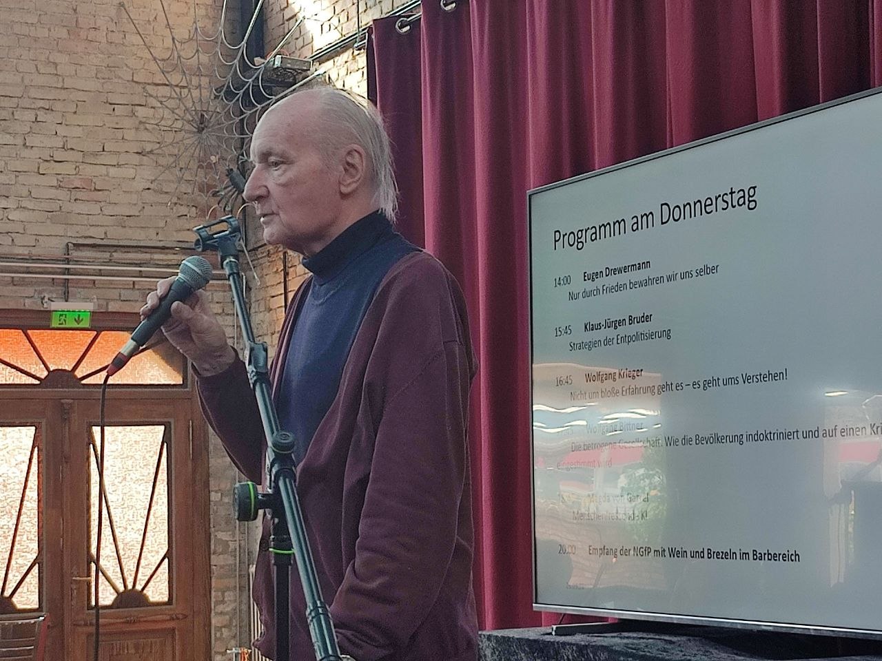 Der Publizist Dr. Wolfgang Bittner wird zum Thema "Wie die Bevölkerung indoktriniert und auf einen Krieg eingestimmt wird" vortragen. Aus seiner Perspektive wurde die Gesellschaft seitens der Regierung schon seit Jahren darauf vorbereitet, autoritäre politische Maßnahmen zu akzeptieren. In seiner Zusammenfassung führte er dazu aus: Die Verhältnisse in Deutschland haben sich in den vergangenen Jahren – politisch gesteuert – grundlegend verändert: