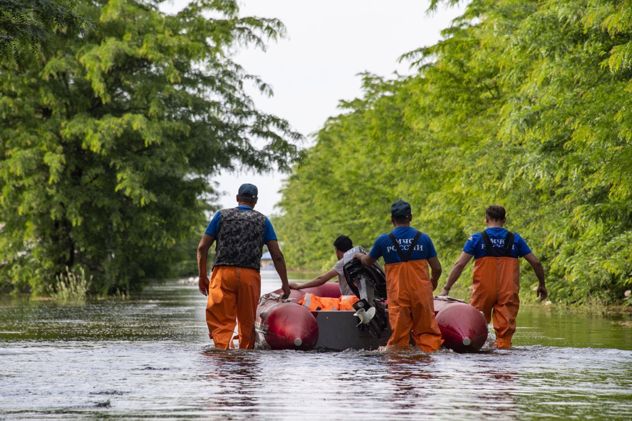 Wie es heißt, geriet in der Stadt Kachowka ein Kleinbus nach dem Abwurf eines Sprengsatzes durch eine Drohne in Brand. Dieser sei vom russischen Katastrophenschutz mittlerweile gelöscht worden.