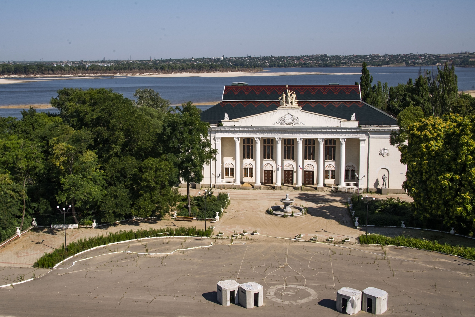 Archivbild: Das Haus der Kultur am Hauptplatz der Stadt Kachowka, 6. Juli 2023.DMITRI MAKEJEW / Sputnik Die Behörden des von Russland kontrollierten Teils des Gebiets Cherson melden anhaltende Angriffe auf Ortschaften am linken Dnjepr-Ufer. Demnach habe die ukrainische Artillerie im Laufe des 9. August 19 Geschosse auf fünf Orte abgefeuert. In Kachowka habe es sechs Einschläge gegeben. In Aljoschki seien vier Geschosse eingeschlagen, in Gornostajewka, Dnjeprjany und Nowaja Kachowka jeweils drei. In Dnjeprjany sei eine Postfiliale beschädigt worden.