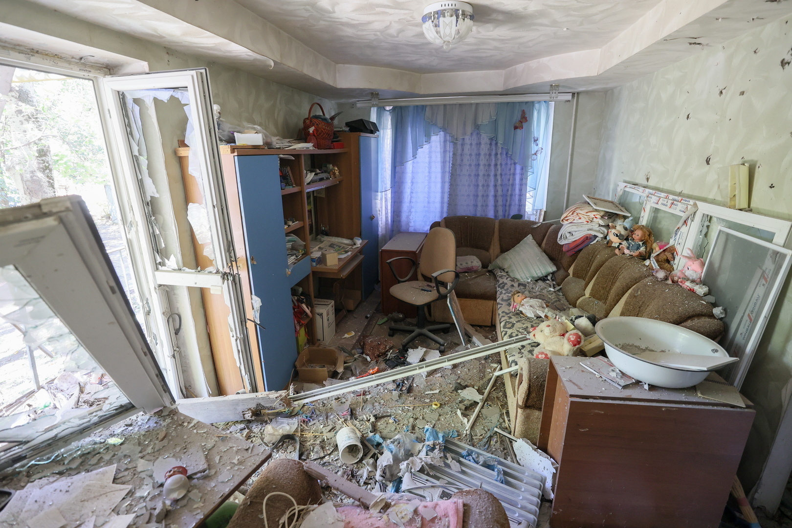 Archivbild: Folgen eines ukrainischen Angriffs auf Donezk, 22. Juli 2024.TAISSIJA WORONZOWA / Sputnik Die Behörden in Donezk haben innerhalb der vergangenen 24 Stunden 22 Angriffe durch die ukrainischen Truppen registriert. Demnach wurden auf das Territorium der Volksrepublik 62 Geschosse abgefeuert. Bei den Angriffen im Zeitraum von 0 Uhr am 9. August bis 0 Uhr am 10. August (Ortszeit) wurden zwei zivile Einwohner verletzt. Durch den Beschuss wurden fünf Häuser, ein ziviles Infrastrukturobjekt und zwei Autos beschädigt.