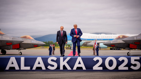 Das Bild zeigt Trump und Putin nebeneinander während des offiziellen Fototermins im Rahmen des Gipfeltreffens in Anchorage auf Alaska. Wie die russische Nachrichtenagentur RIA Nowosti feststellte, ist es die gleiche Aufnahme, die Trump im Oval Office am 22. August 2025 demonstriert hatte.