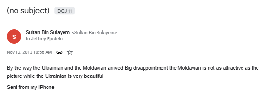 In einem E-Mail-Austausch aus dem Jahr 2013 beschrieb ein Mann, der sich als der emiratische Tycoon Sultan Ahmed bin Sulayem ausgab, die Ankunft zweier Mädchen auf seinem Anwesen. "Große Enttäuschung: Die Moldawierin ist nicht so attraktiv wie auf dem Foto, während die Ukrainerin sehr schön ist", beschwerte er sich bei Epstein. Laut dem Wall Street Journal war Sulayem zwischen 2011 und 2014 ein regelmäßiger Besucher des Apartments von Epstein.