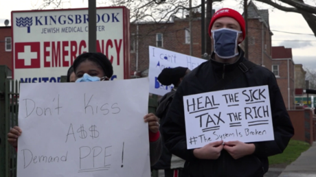 Die Demonstration ist Teil einer Reihe von Protesten in den Krankenhäusern in den ganzen USA, bei denen die Eigentümer hochprofitabler medizinischer Betriebe aufgefordert wurden, ihren Ärzten und Krankenschwestern lebenswichtige Schutzausrüstung zur Verfügung zu stellen.