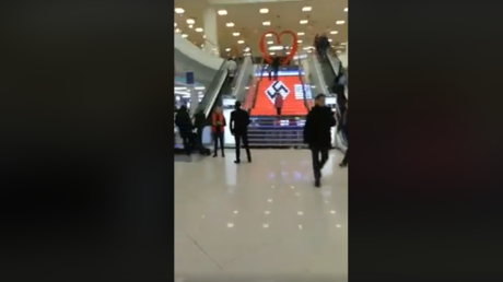 Offenbar scheint ein riesiges Hakenkreuz am helllichten Tage in einem Einkaufszentrum in Kiew auch niemanden mehr zu erschrecken. Kunden gehen die Treppe hinauf und hinunter, obwohl darauf ein Hakenkreuz auf rotem Grund, ähnlich der Flagge Nazi-Deutschlands, abgebildet ist. Der Direktor des Jüdisch-Ukrainischen Komitees, Eduard Dolinsky, veröffentlichte ein entsprechendes Video auf Twitter: