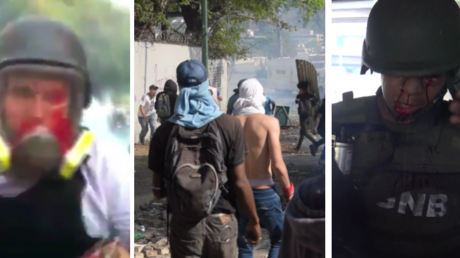 Aufnahmen zeigen, dass mehrere Nationalgardisten bei Angriffen von Guaidós-Anhängern verletzt wurden. Sie suchen nahe der Autobahn von Altamira Schutz. Einer der Verletzten blutet aus einer Wunde am Auge.