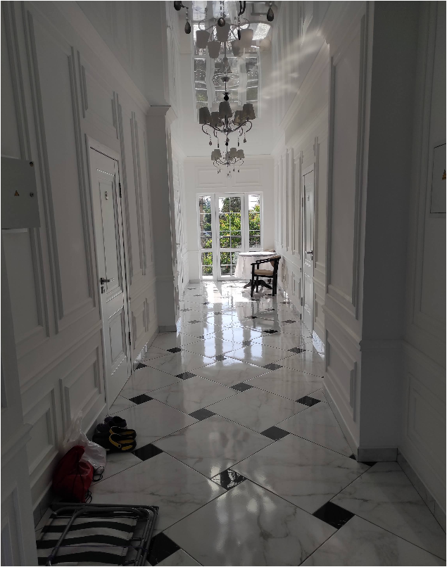 Dass ein solches Hotel in einem Dorf stand, dessen Bevölkerung selbst vor dem Krieg weniger als 1.000 Menschen maß, ist eigentlich kaum zu glauben: vier Sterne, die sich auch in Moskau durchaus als solche hätten behaupten können – Marmorfliesen auf dem Fußboden, weiße Paneele an den Wänden, schöne Möbel und in jedem Zimmer ein Balkon mit gusseisernem Geländer. Und natürlich eine schöne Aussicht auf das Schwarze Meer.