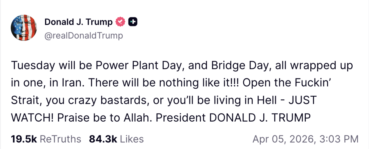 "Open the f**king strait, you crazy bastards, or you'll be living in hell. JUST WATCH! Praise be to Allah", schrieb der US-Präsident auf seiner Truth-Social-Plattform.