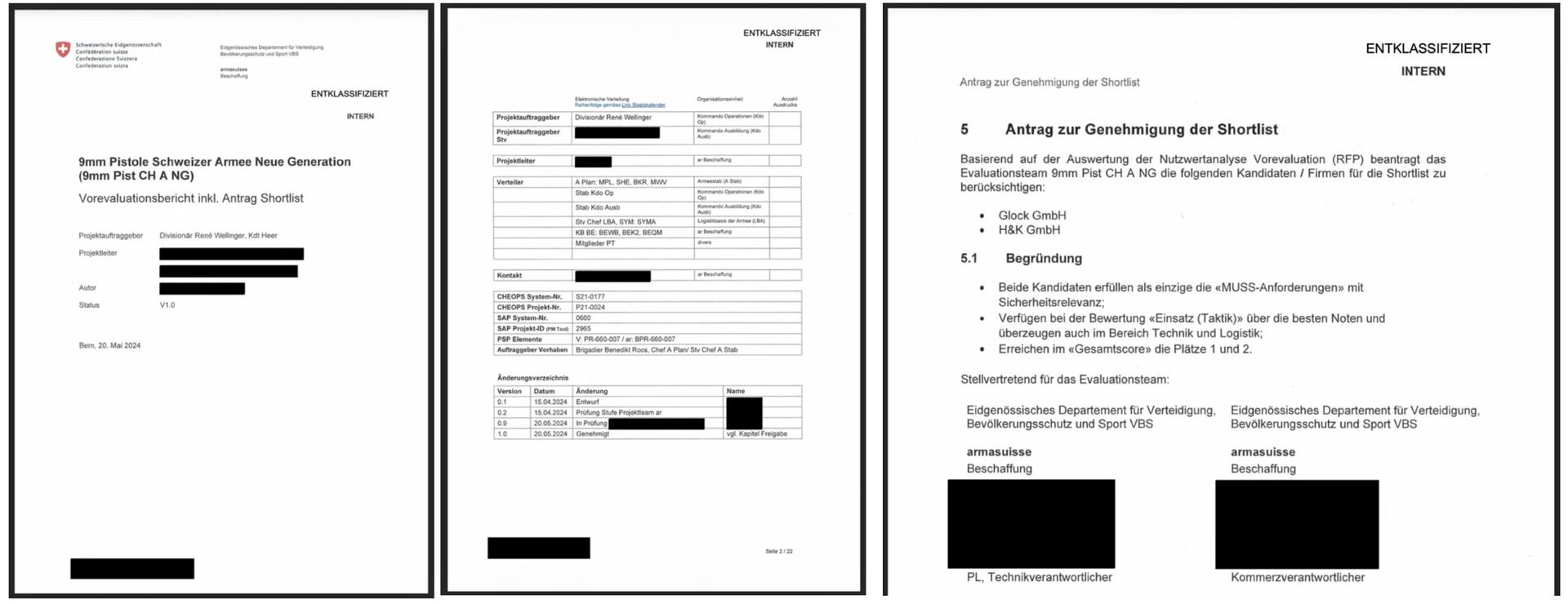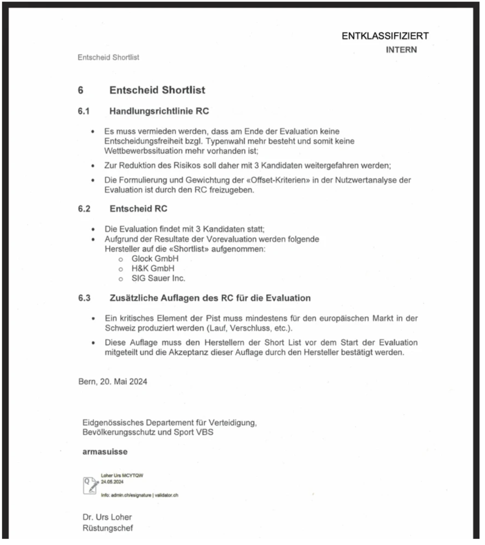 Trotz dieses klaren fachlichen Befunds griff der zuständige Rüstungschef Urs Loher in das Verfahren ein. Er setzte die P320 auf die Shortlist und führte nachträglich eine Vorgabe ein, wonach ein zentrales Bauteil in der Schweiz produziert werden muss.