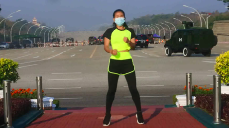 Offenbar ungestört von dem laufenden Militärputsch in Myanmar hat eine Sportlehrerin ihr morgendliches Aerobic-Programm absolviert und dabei ungewollt Straßensperren, Militärfahrzeuge und Soldaten gefilmt. Die junge Frau in neongelber Sportbekleidung tanzt und springt dabei unbekümmert zu dynamischer Musik. Im Hintergrund ist eine breite Straße in der Hauptstadt Naypyidaw zu sehen, auf der plötzlich ein Militärkonvoi vorbeirollt. Im früheren Birma hatten sich die Streitkräfte am Montag an die Macht geputscht.