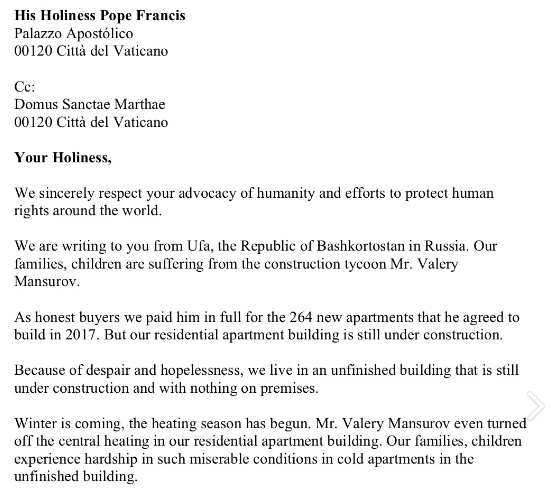 Da sie keinen anderen Ausweg sahen, sind die verärgerten Hausbewohner dem Vorschlag gefolgt. Sie verfassten ein kollektives Schreiben und stellten es in englischer und russischer Sprache im sozialen Netzwerk Vkontakte online. Sie baten den Papst, für sie zu beten und ihre "legitimen Rechte zu verteidigen".
