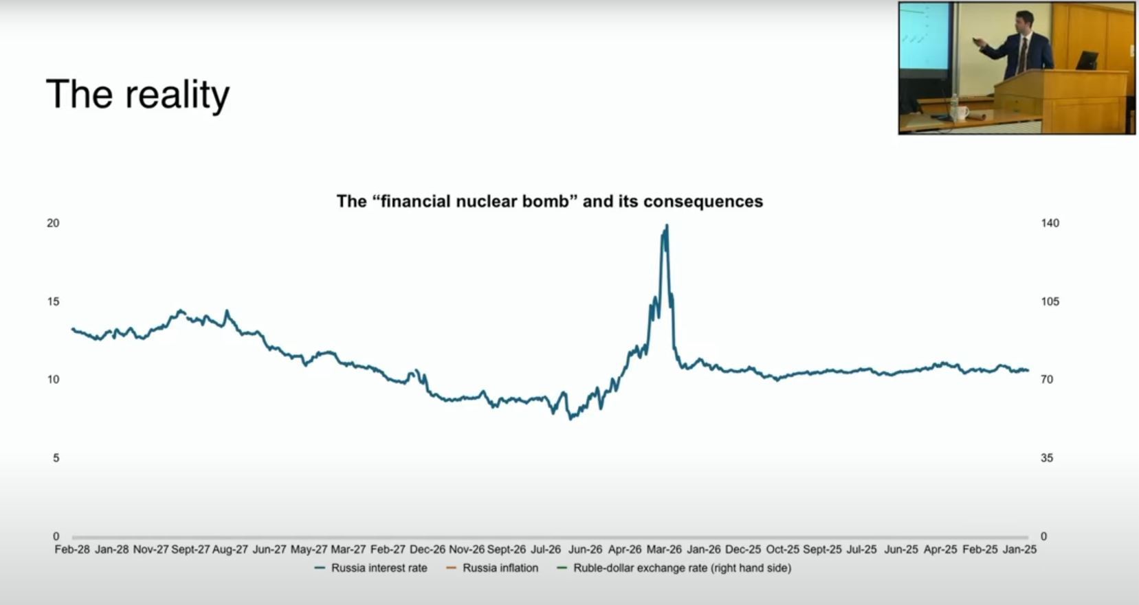 Nachdem im Februar 2022 die Sanktionen verhängt worden seien, habe der Rubel "sofort die Hälfte seines Wertes" verloren, da alle versucht hätten, "ihr Kapital aus Russland herauszuholen und es an einem anderen Ort in Sicherheit zu bringen", rekapituliert Freymann die damaligen Ereignisse. Doch die russische Zentralbank habe eine Reihe "entschlossener Maßnahmen" ergriffen, die die Lage innerhalb weniger Wochen stabilisiert habe.