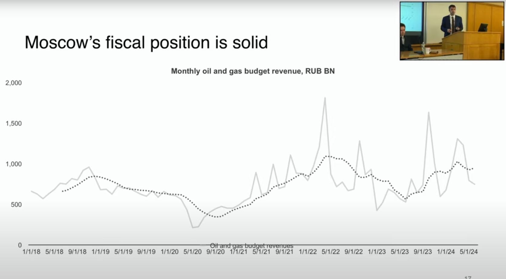 Um diesen Punkt zu veranschaulichen, blendete Freymann während seines Vortrags weitere Grafiken ein – denn das sei wichtig, um zu verstehen, "warum viele, die sich mit den Sanktionen gegen Russland befassen, diese als Fehlschlag betrachten." Der Amerikaner zeigte sodann eine Grafik der monatlichen Einnahmen Russlands aus Öl- und Gasverkäufen.