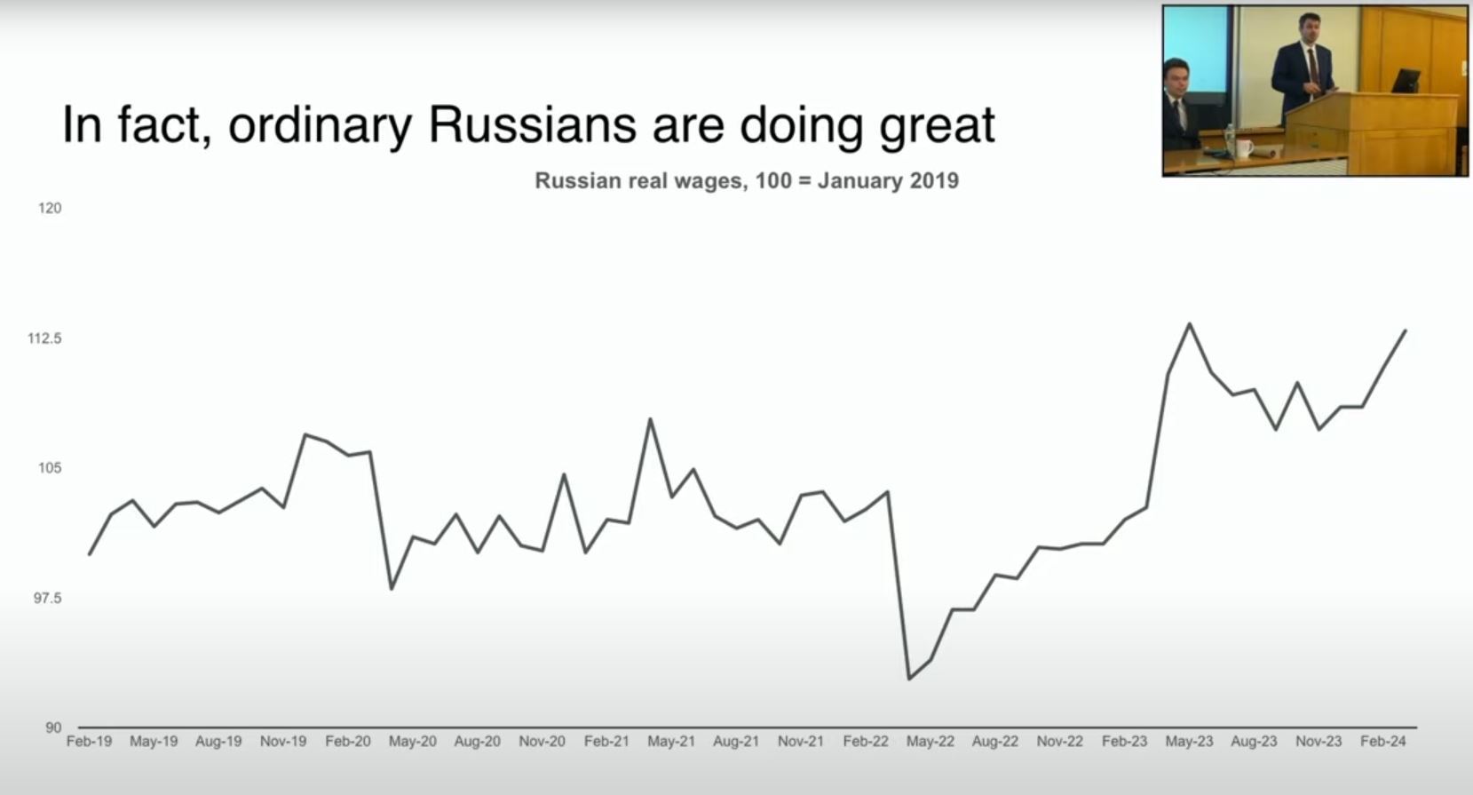 Die letzte von ihm in diesem Zusammenhang gezeigte Grafik ist vielleicht auch die aussagekräftigste. Es geht um die realen Einkommen, also die inflationsbereinigten Löhne russischer Haushalte.