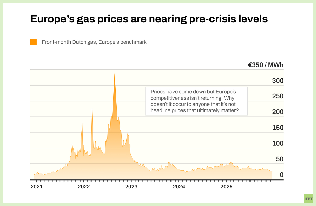 Der Artikel erwähnt beiläufig eine aufschlussreiche Tatsache: Der europäische Verbrauch liegt rund 20 Prozent unter dem Niveau vor 2022. Dies ist nichts anderes als ein Nachfrageeinbruch, der sich als Stabilität tarnt. Europas zusätzliches Angebot besteht mittlerweile aus LNG, nicht mehr aus Pipelinegas, und LNG ist strukturell energieintensiver. Gleichzeitig wurden die Kosten verstaatlicht, Kapital abgeschrieben und – am bezeichnendsten – die Nachfrage ist eingebrochen.